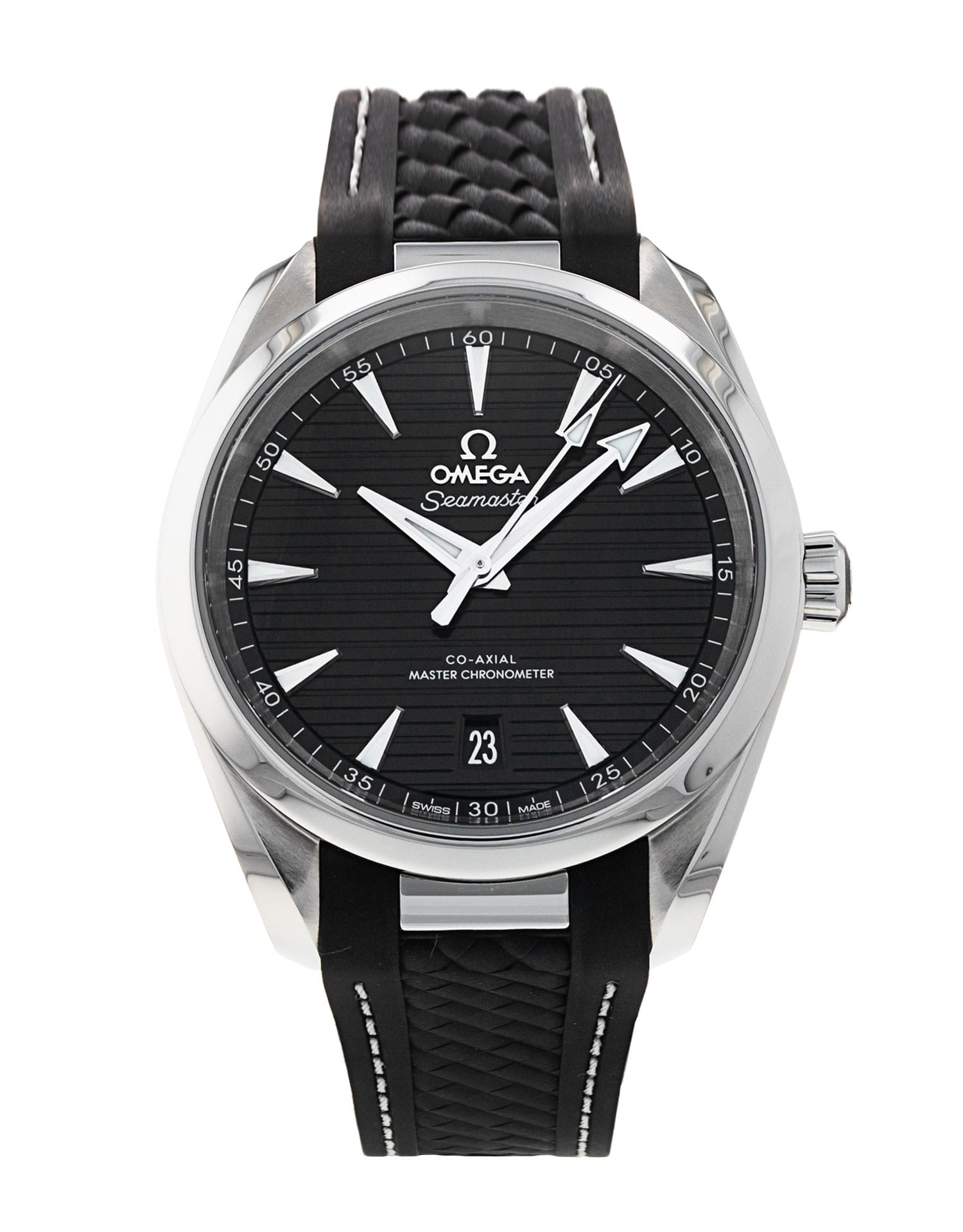 This Omega Aqua Terra 150m Gents 220.12.38.20.01.001 has a black baton dial and a rubber strap. This Omega has undergone a thorough inspection of accuracy, functionality and condition at our Omega certified service centre to determine the level of reconditioning required to meet our strict standards. It has also been checked against our records to ensure authenticity. Our watches have a 24-month warranty for your peace of mind, in conjunction with any remaining manufacturer’s warranty from new or from service.