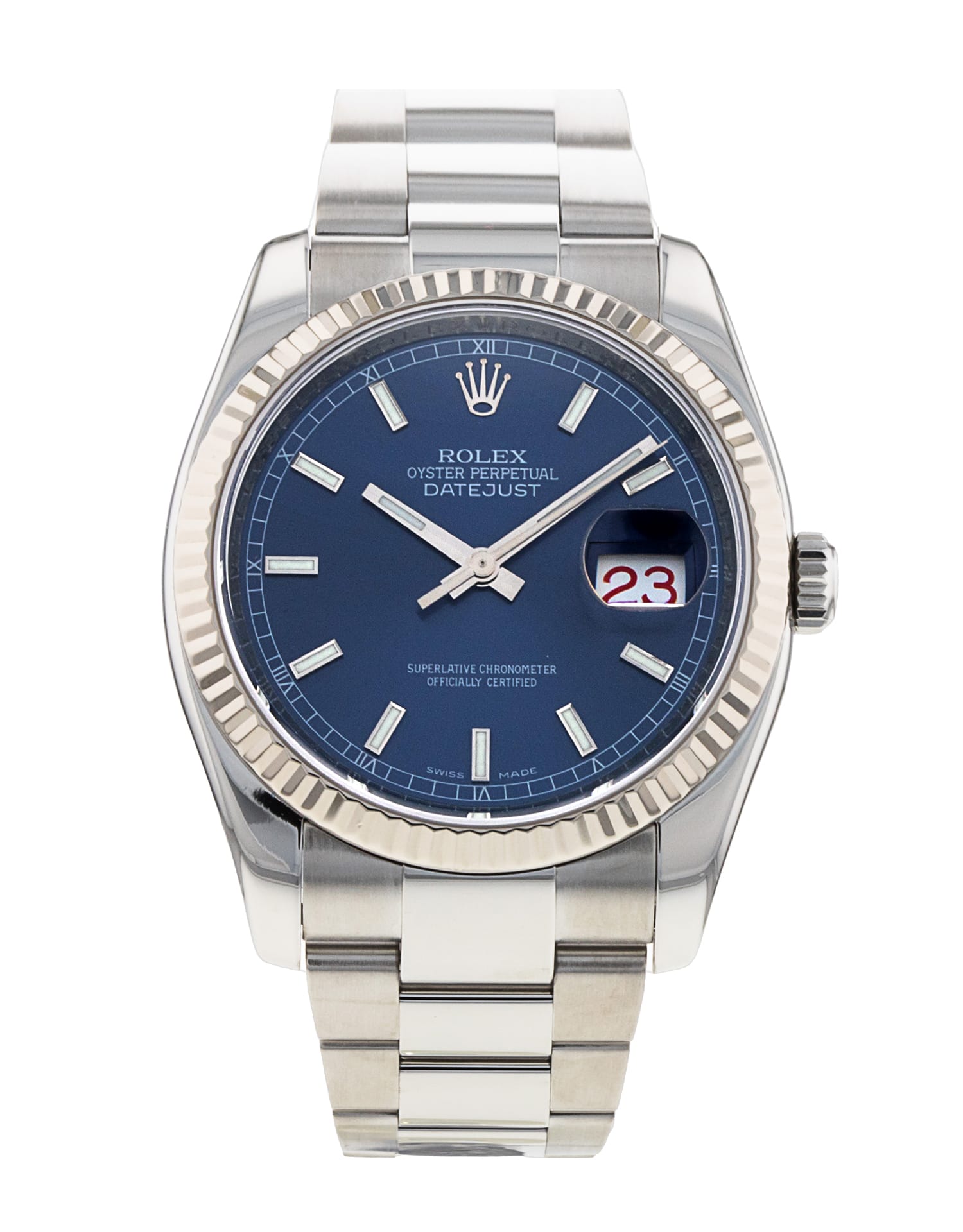 This Rolex Datejust 116234 has a blue baton dial and a bracelet strap. This Rolex has undergone a thorough inspection of water resistance, accuracy, functionality and condition to determine the level of reconditioning required to meet our strict standards. It has also been referenced against technical documents and manufacturer records where available to ensure authenticity and a clean history. All our watches have a 24-month warranty for your peace of mind. One of our skilled polishing technicians has removed marks on the case and bracelet of this watch, brought about by daily wear and tear, which is why this watch does not come with the remaining manufacturer’s warranty.