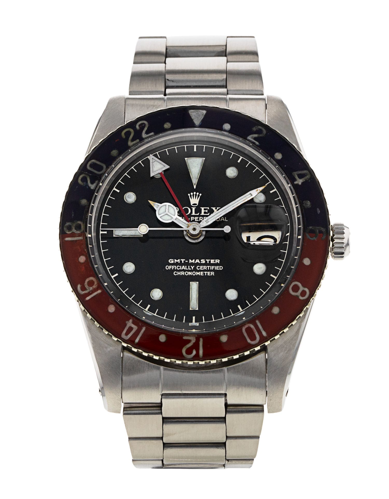 This Rolex GMT Master 6542 has a black baton dial and a bracelet strap. Due to age, this Rolex may not fall within our typical expected tolerances for timekeeping, and is no longer suitable for use in wet environments or submersion in water. In the interests of preserving original features, utmost care has been taken to sympathetically restore this watch. It has also been referenced against technical documents and manufacturer records where available to ensure authenticity and a clean history. One of our skilled polishing technicians has removed marks on the case and bracelet of this watch, brought about by daily wear and tear, which is why this watch does not come with the remaining manufacturer’s warranty.